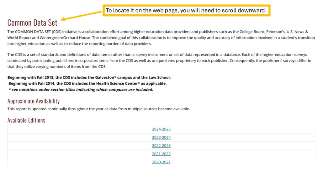 That said, it’s not always easy to find. The CDS is often buried deep in a university’s institutional research or planning office webpage. For example, Texas A&M’s CDS can only be found with a targeted Google search like “Texas A&M Common Data Set 2023.” Once you know where to look, however, it becomes one of the most powerful tools in your admissions research.